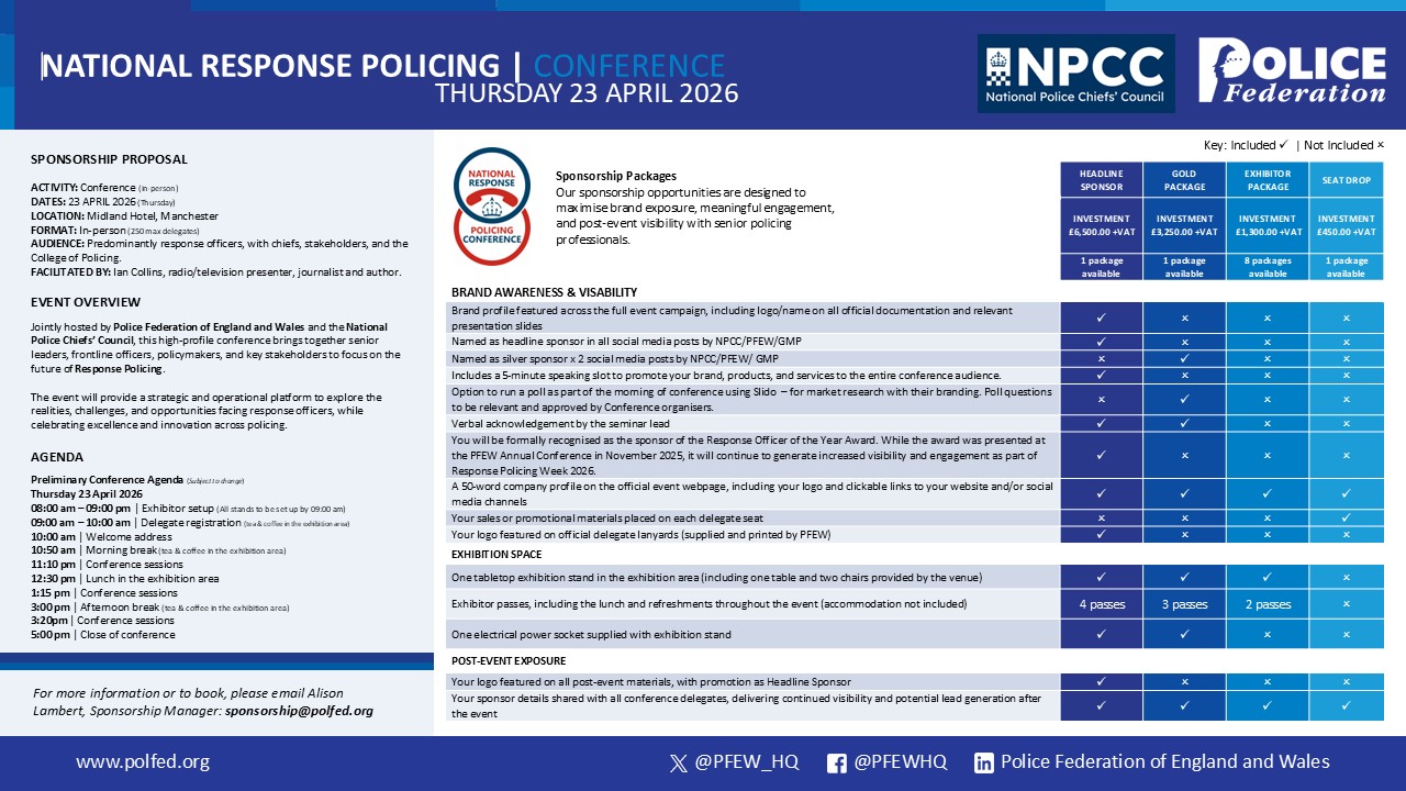 National Response Policing Conference | 23 April 2026 | Midland Hotel, Manchester - Interested in supporting the event, click here to view the Sponsorship Proposal.