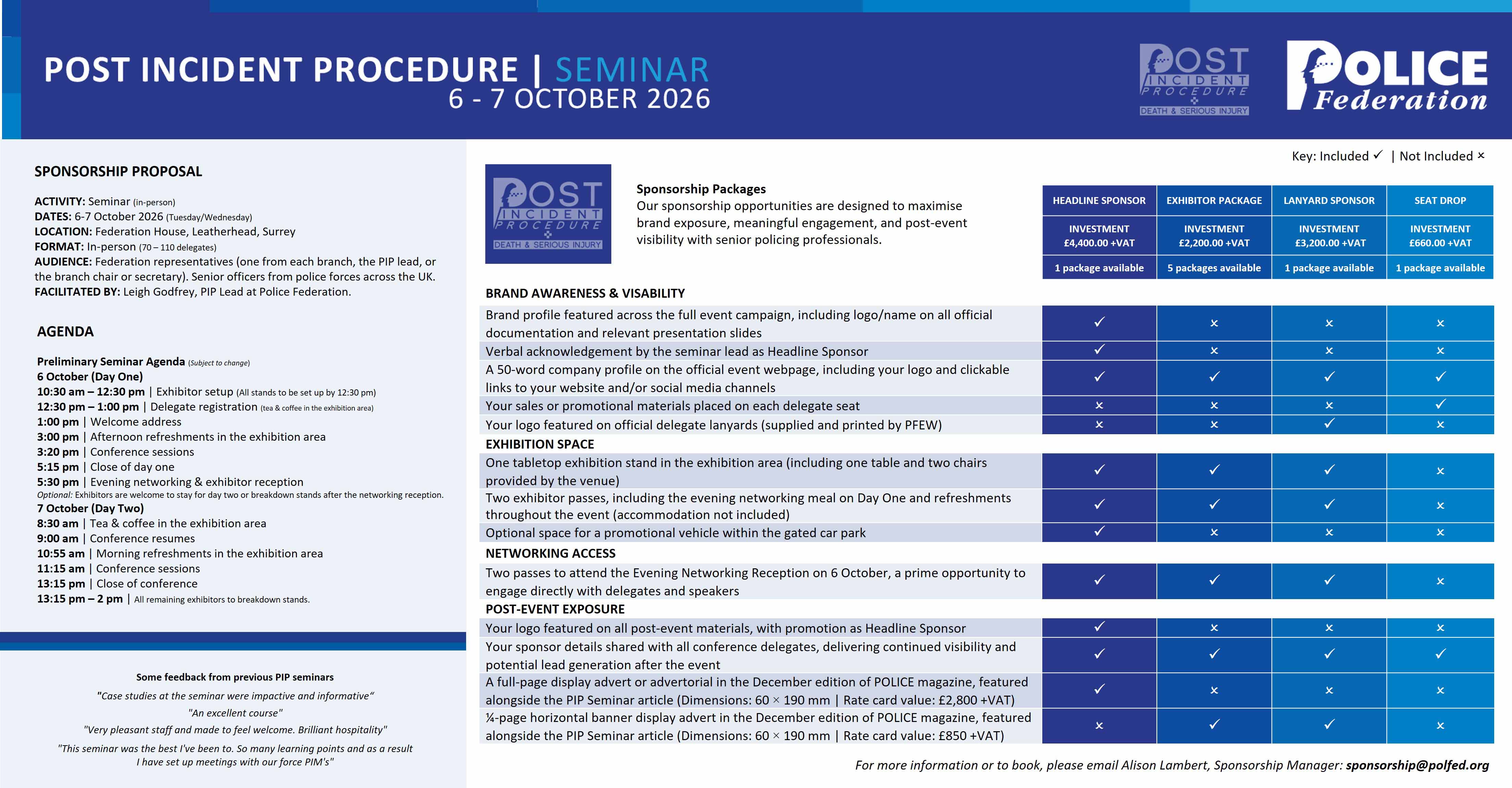 Post Incident Procedure (PIP) Seminar | 6-7 October 2026 | Federation House, Leatherhead, Surrey - Interested in supporting the event, click here to view the Sponsorship Proposal.